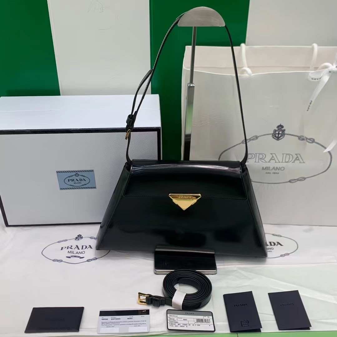 Pra*a buckle leather handbag with double belt-35*25*14cm